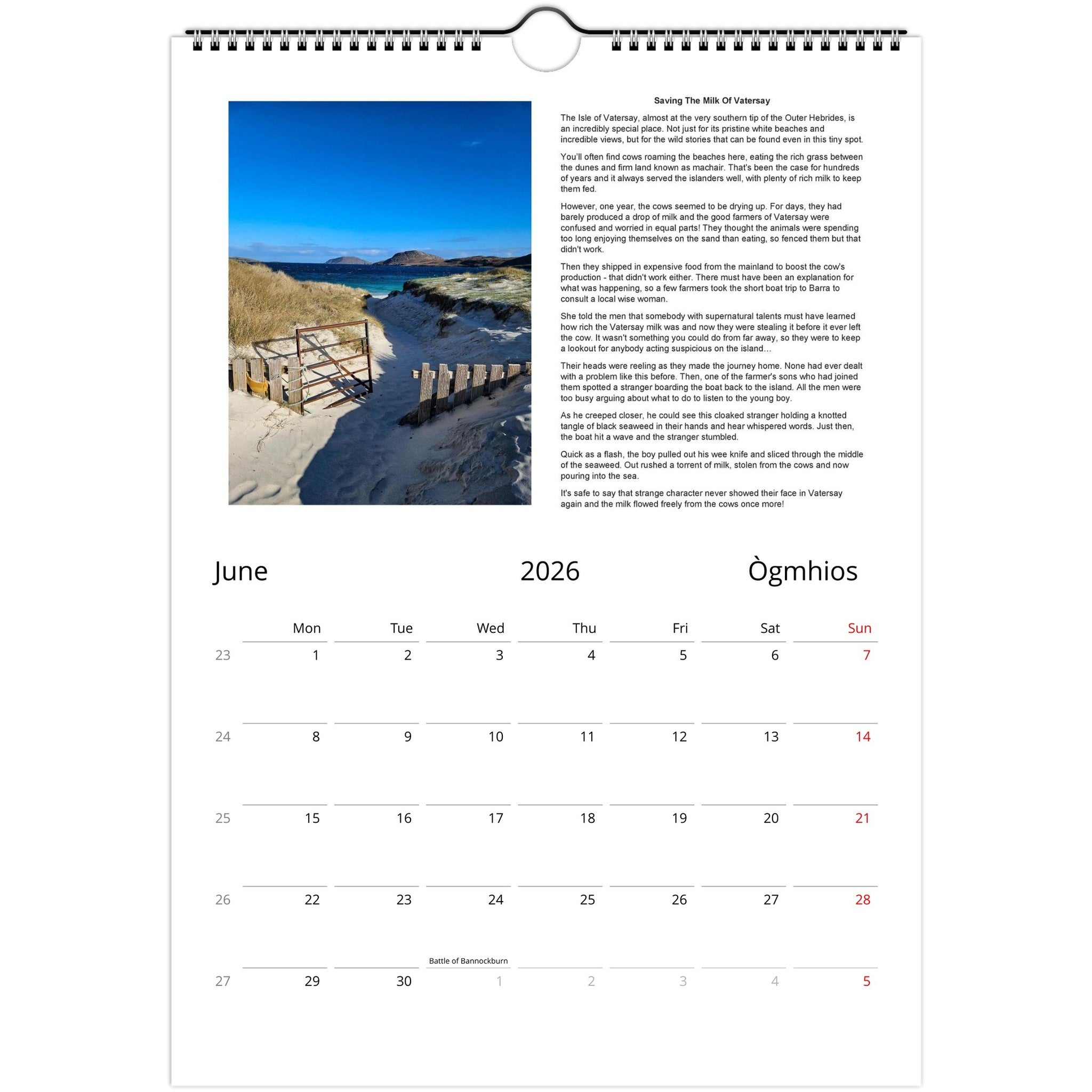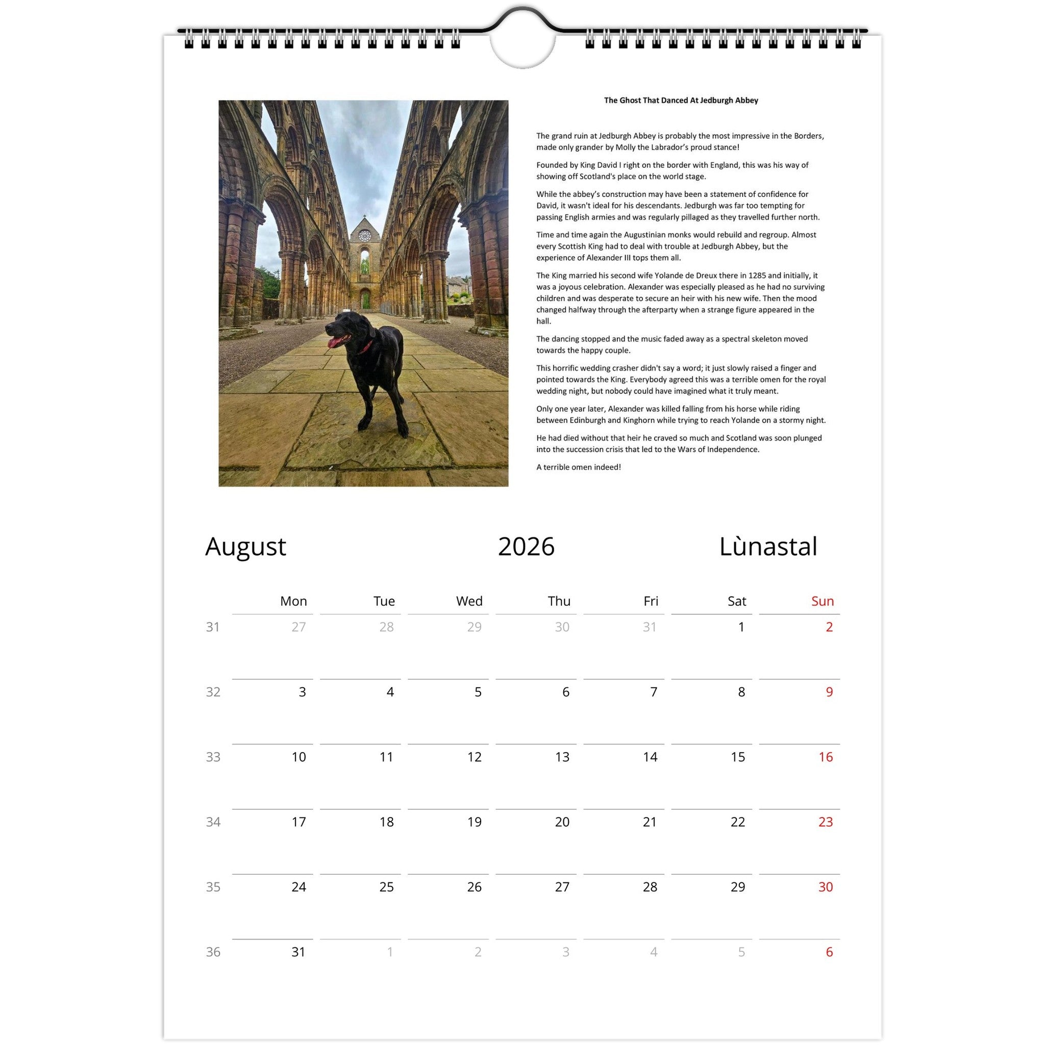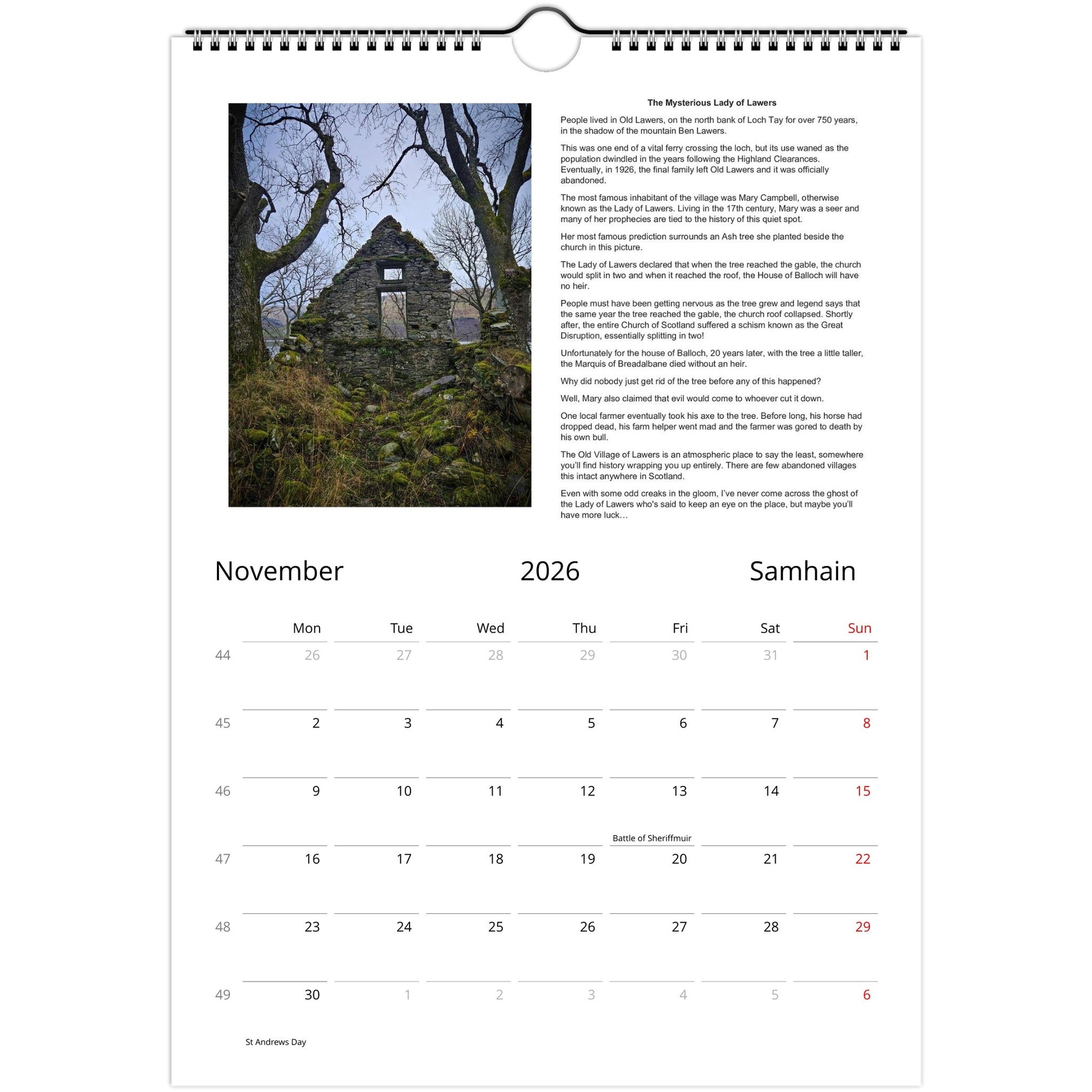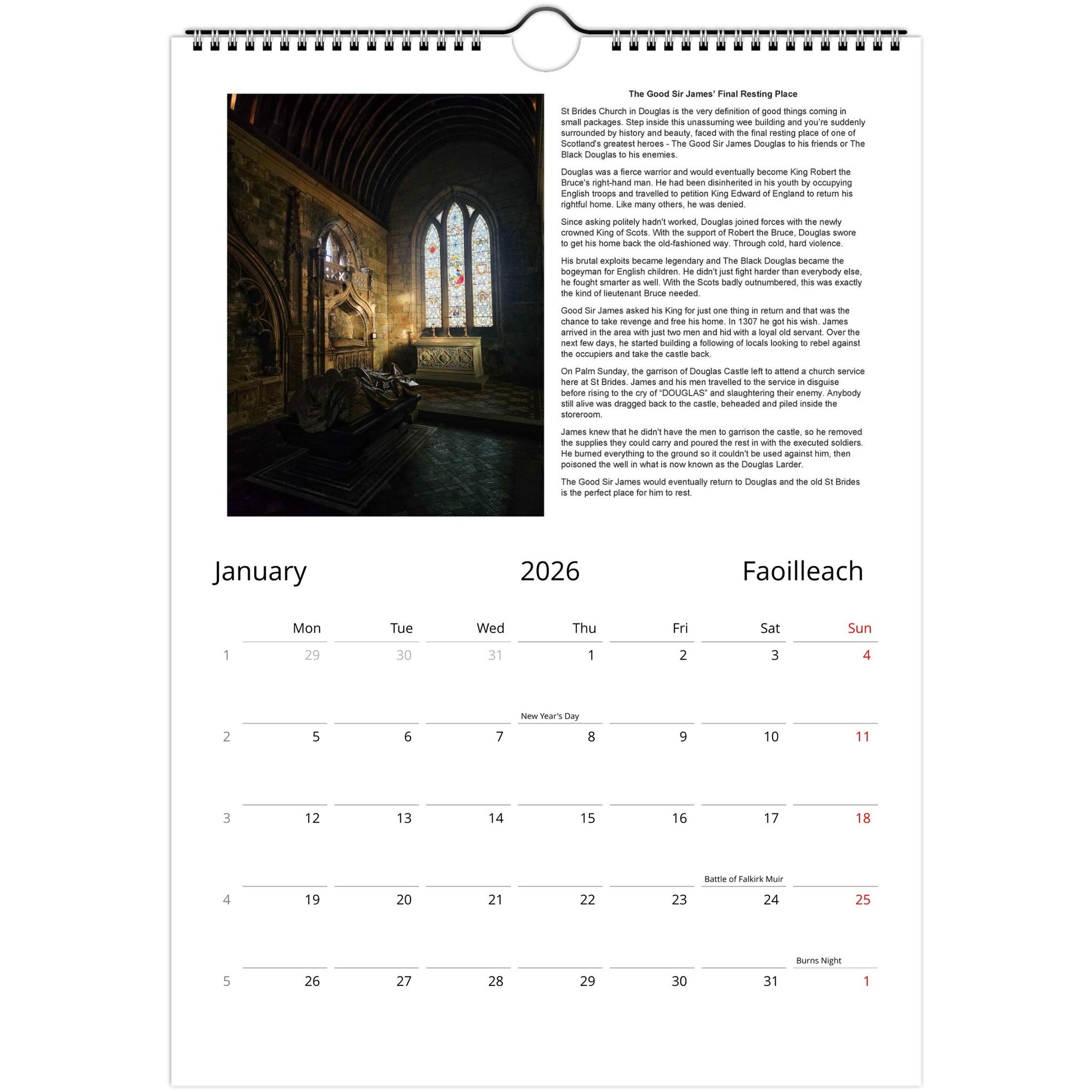 Each month features a different Scottish scene and accompanying story. Key dates in Scottish history are marked throughout the year, with plenty of space to mark your own events!